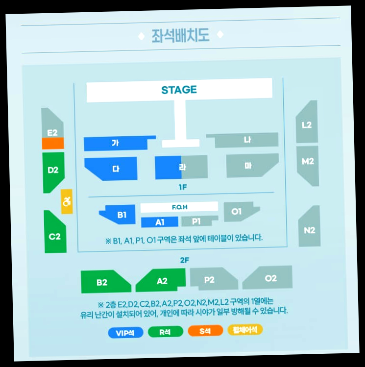 VIP석은 무대와 가장 가까워 생생한 표정을 볼 수 있지만, R석은 전체적인 무대 연출을 감상하기에 좋습니다.