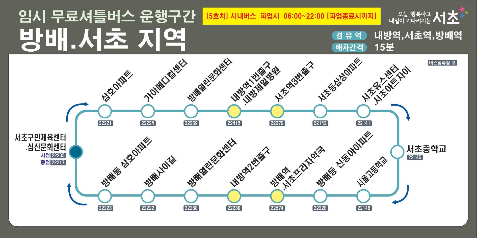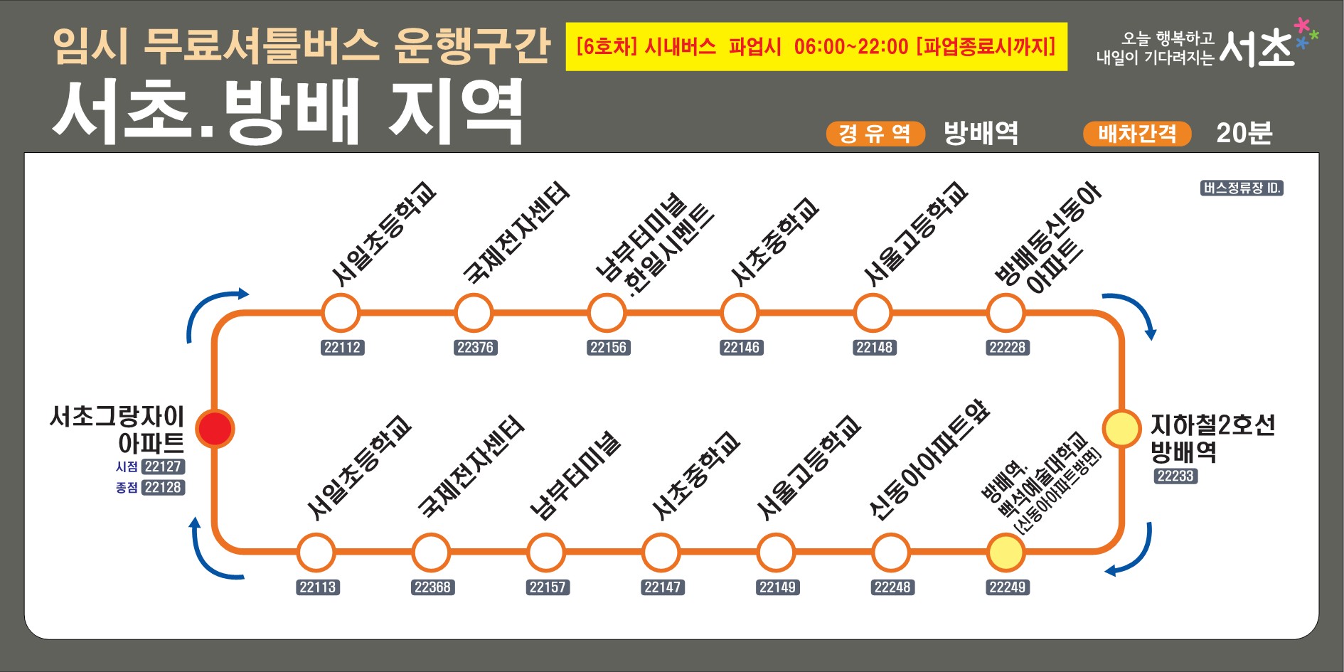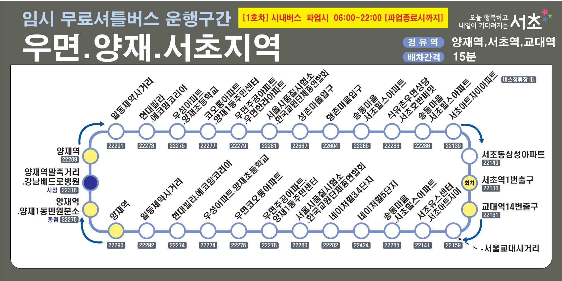 | SC-06 | 우면동 → 서래마을 → 방배역 | 주거 밀집 지역 우선 |