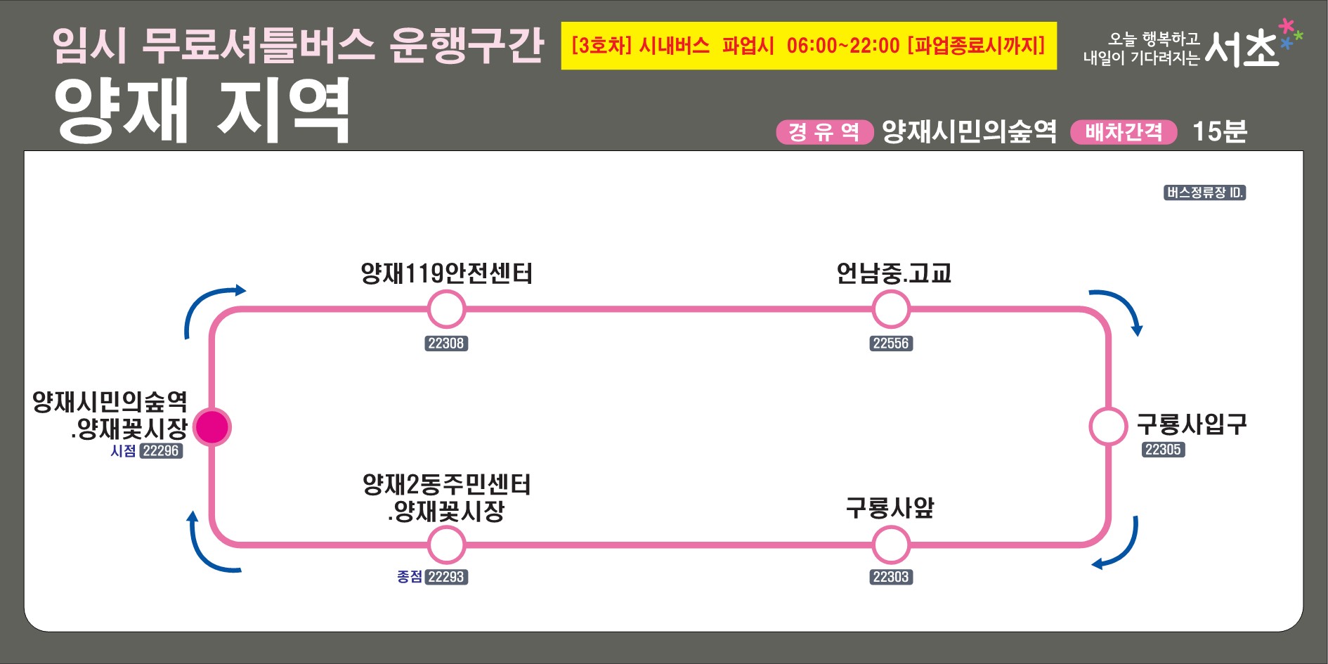 | SC-04 | 서초구청 → 내곡동 → 양재시민의숲 | 공공기관 방문자 중심 |