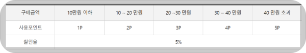 중소기업 제품을 5% 할인받을 수 있는데, 구매 금액에 따라 1~5P가 차감됩니다.