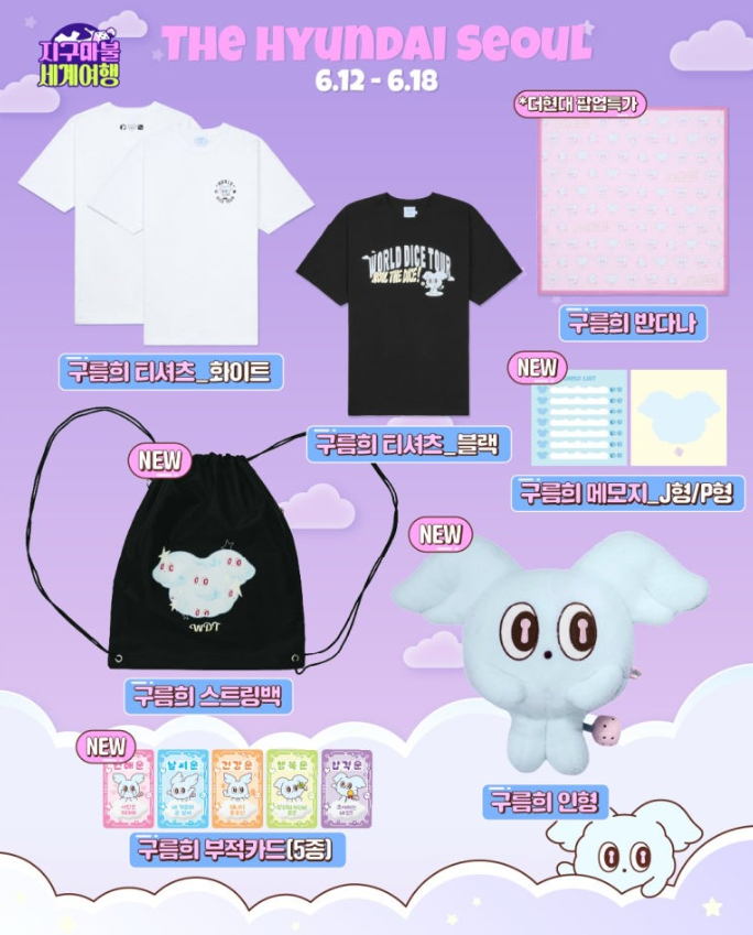 이번 팝업스토어의 메인 테마는 바로 마스코트 ‘구름희’입니다. 팬들의 뜨거운 반응에 힘입어 다양한 굿즈 상품이 준비되었어요: